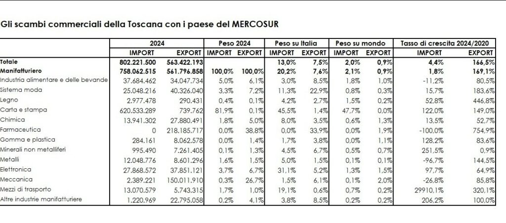 Al momento la bilancia commerciale è negativa: la Toscana importa dal Mercosur prodotti per 802 milioni di euro, soprattutto cellulosa per fare la carta nel distretto lucchese (620 milioni di euro), seguita a distanza lontana da prodotti alimentari e bevande (37,7 milioni di euro). Il deficit commerciale nel 2024 è stato di 239 milioni di euro. L’obiettivo dev’essere quello di riportare in equilibrio la bilancia.